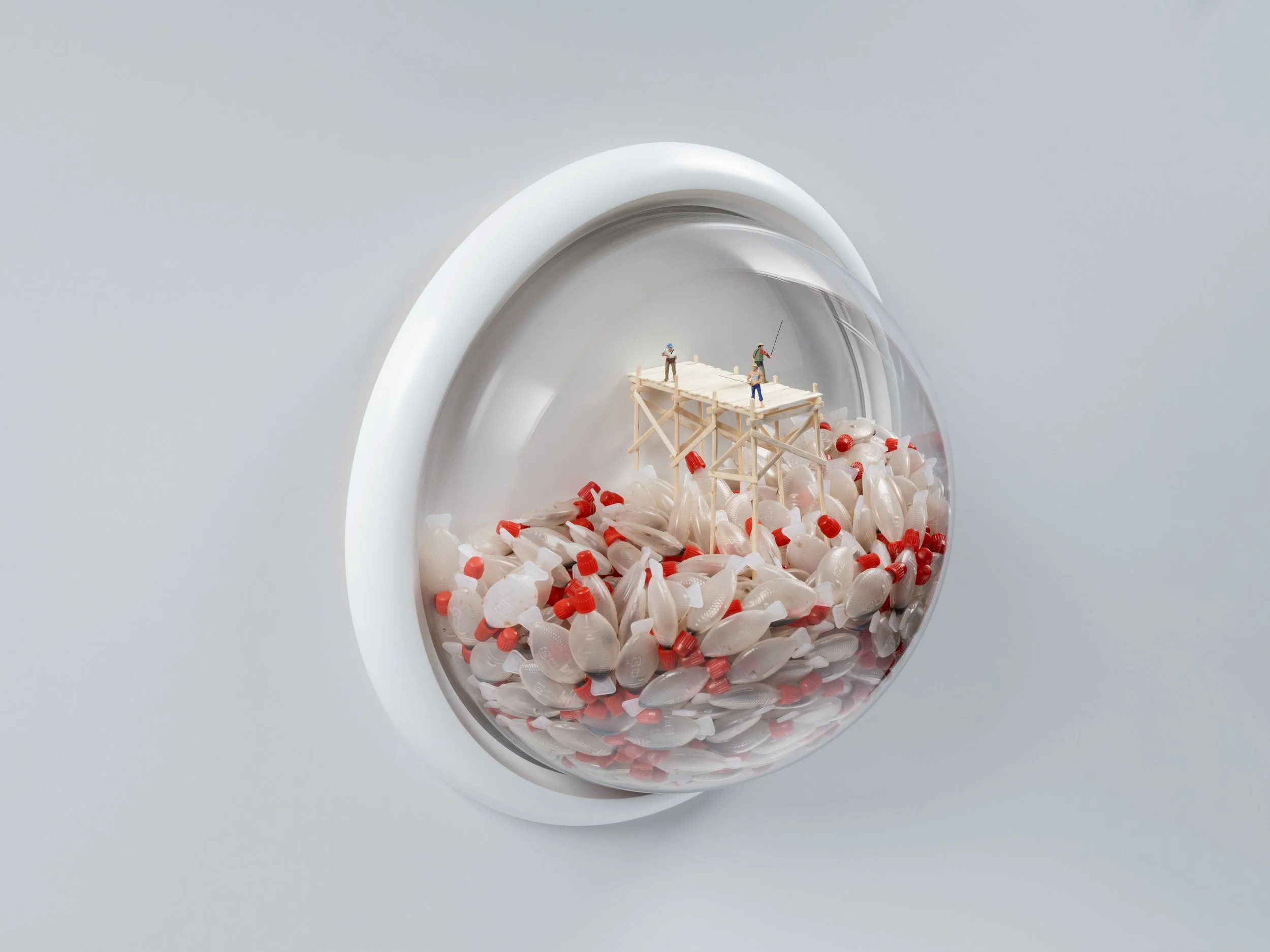 Displayed within a clear dome, this miniature scene mirrors the growing tide of plastic waste that overwhelms our oceans. Tiny figures fishing into an ocean of discarded plastic, evoking a haunting image of abundance replaced by waste.